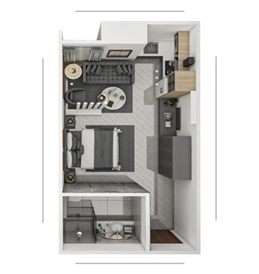 Prestigious in every way imaginable, the Classic Living Studio Apartments deliver unrivaled excellence. The spacious kitchen, with its flawless design, impeccable cabinetry finishes, and illuminating lighting, combines dazzling visuals with elite functionality.