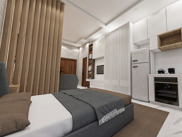Prestigious in every way imaginable, the Classic Living Studio Apartments deliver unrivaled excellence. The spacious kitchen, with its flawless design, impeccable cabinetry finishes, and illuminating lighting, combines dazzling visuals with elite functionality.